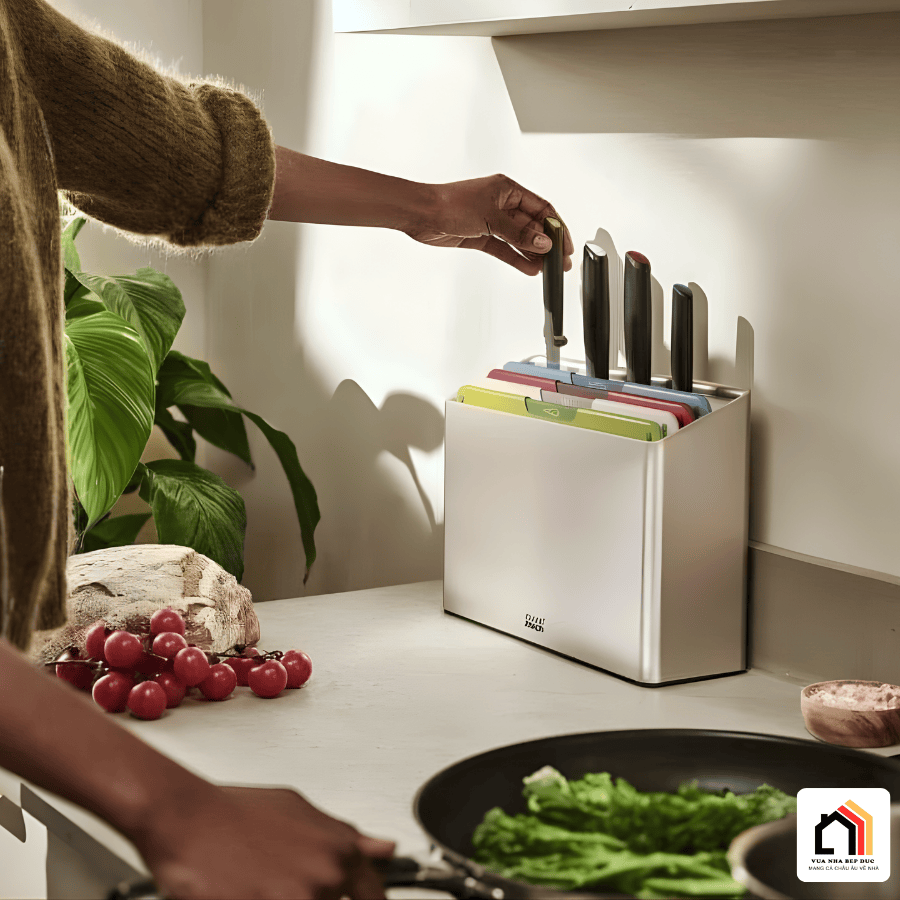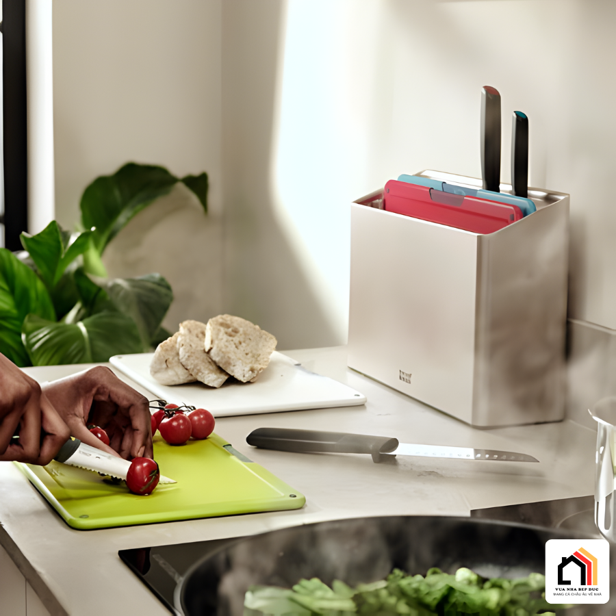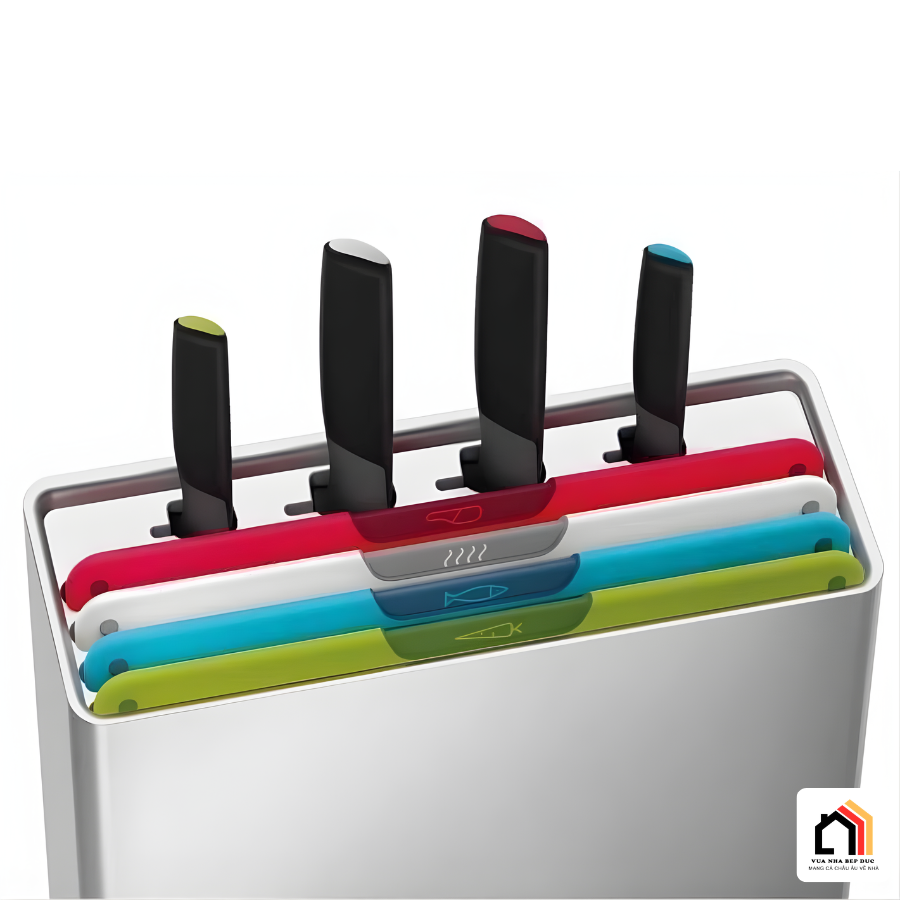 Điểm cộng lớn khác của Bộ Dao Thớt Joseph Joseph Folio Plus (Mcolour) nằm ở phần hộp đựng thông minh. Hộp được thiết kế với các khe thoáng khí giúp dụng cụ luôn khô ráo, hạn chế ẩm mốc và giữ vệ sinh tối đa sau khi sử dụng. Nhờ cấu trúc gọn gàng, các thớt và dao được sắp xếp ngay ngắn, tiết kiệm diện tích mặt bàn bếp.