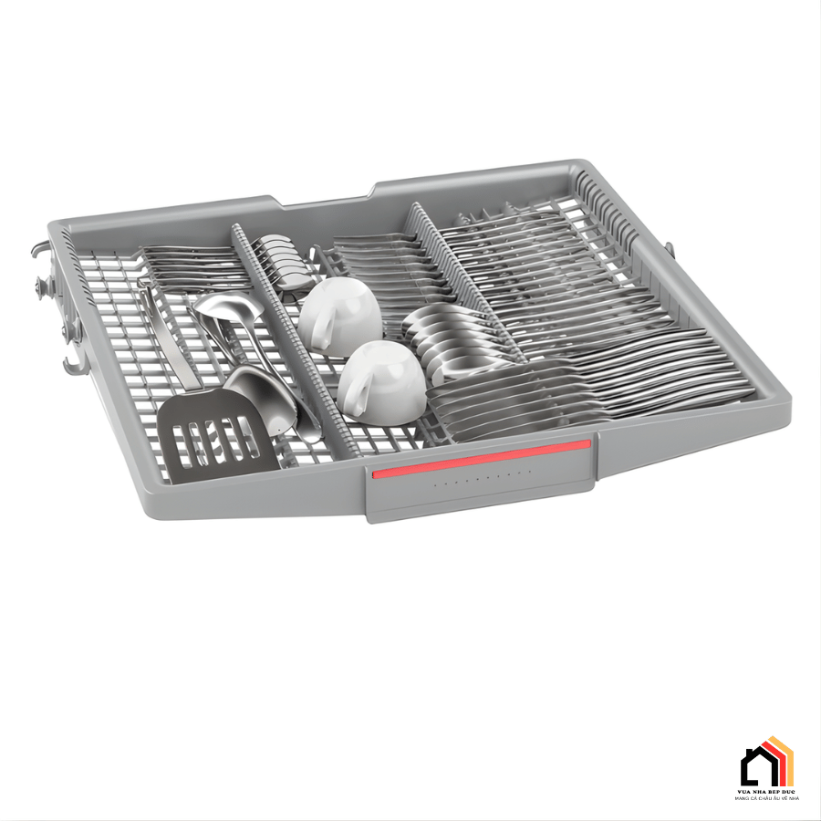 Ngăn kéo VarioDrawer của Máy rửa bát độc lập Bosch SMS6ZCI16E PerfectDry được thiết kế lại với các hốc chứa rộng rãi, phù hợp cho dao kéo lớn, muỗng, thìa hoặc các vật dụng nhỏ. Các điểm điều chỉnh màu đỏ giúp người dùng dễ dàng nhận biết và thao tác nhanh chóng. Nhờ đó, không gian rửa được mở rộng đáng kể, nâng cao hiệu quả làm sạch mà vẫn giữ được sự gọn gàng.