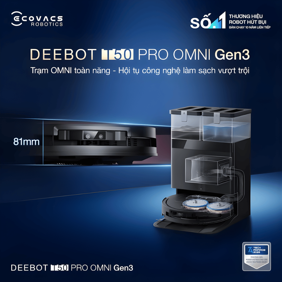 Robot hút bụi lau nhà Ecovacs Deebot T50 Pro Omni Gen 3 là giải pháp dọn dẹp thông minh thế hệ mới, nổi bật với thiết kế siêu mỏng chỉ 81mm giúp dễ dàng làm sạch dưới gầm nội thất. Sản phẩm được trang bị lực hút mạnh mẽ 25.000Pa, công nghệ chống rối tóc ZeroTangle 3.0 và hệ thống lau nhà OZMO Turbo 2.0 với hai đĩa lau xoay kép. Bên cạnh đó, robot còn tích hợp TruEdge 2.0 làm sạch sát cạnh, TrueMapping 2.0 lập bản đồ nhanh, TrueDetect 3D tránh chướng ngại vật chính xác cùng khả năng tự động nâng giẻ lau khi gặp thảm. Trạm OMNI đa năng hỗ trợ hút rác, giặt giẻ nước nóng và sấy khô tự động, mang lại trải nghiệm làm sạch hoàn toàn rảnh tay.