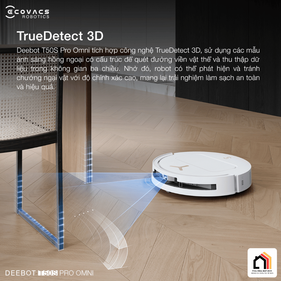 Robot hút bụi lau nhà Ecovacs Deebot T50S Pro Omni ứng dụng công nghệ TrueDetect 3D tiên tiến, sử dụng ánh sáng hồng ngoại có cấu trúc để quét và tái tạo không gian ba chiều xung quanh. Nhờ đó, thiết bị có thể nhận diện chính xác các vật cản nhỏ như dây điện, đồ chơi trẻ em hay nội thất thấp.