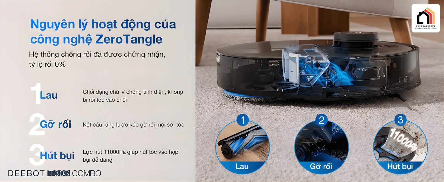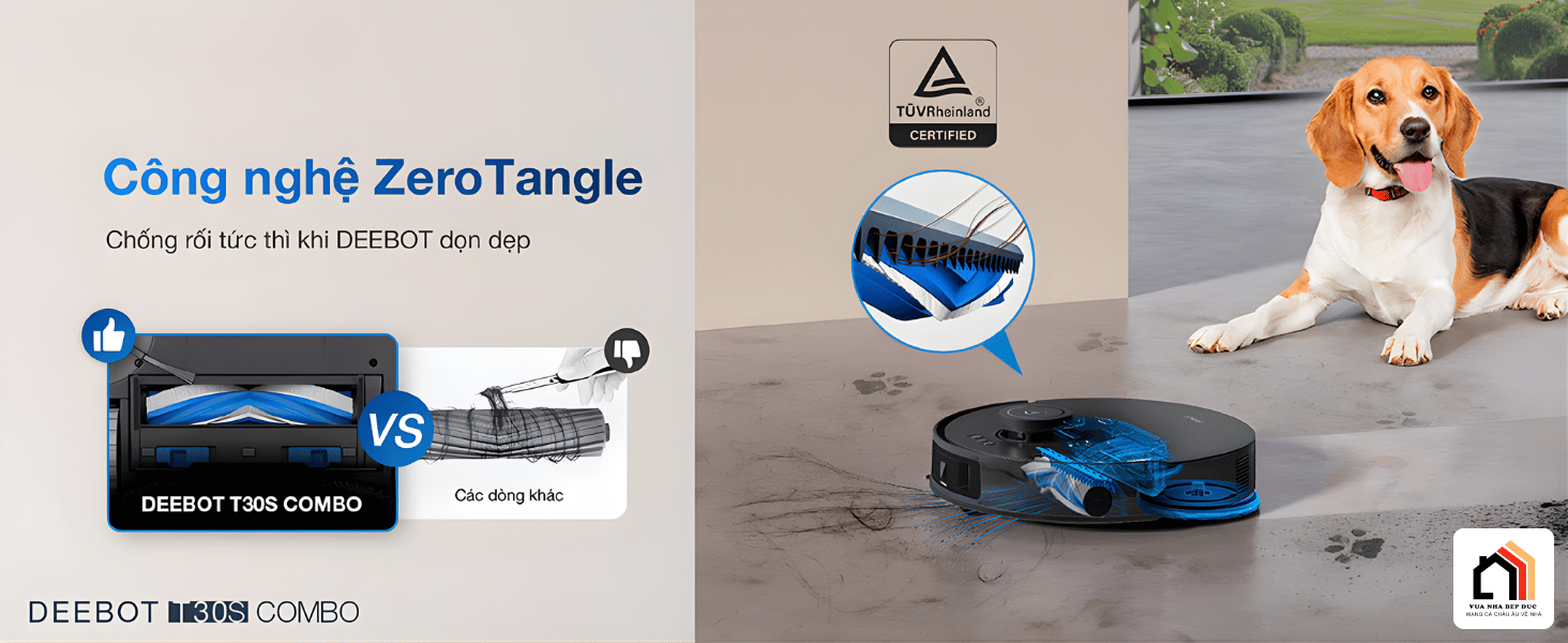 Một trong những điểm nổi bật của Robot hút bụi lau nhà Ecovacs T30S Combo chính là công nghệ chống rối tóc ZeroTangle™. Với thiết kế bàn chải con lăn dạng chữ V cùng góc nghiêng 21°, hệ thống này giúp hạn chế tối đa tình trạng tóc và lông thú bị quấn vào chổi.
