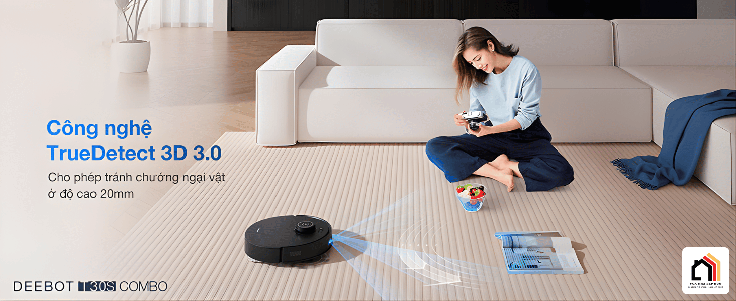 Robot hút bụi lau nhà Ecovacs T30S Combo được trang bị công nghệ TrueDetect 3D 3.0 hiện đại, sử dụng ánh sáng cấu trúc để nhận diện vật thể với độ chính xác đến từng milimet. Nhờ đó, thiết bị có thể phát hiện và né tránh hiệu quả từ những vật nhỏ như dây điện, đồ chơi đến các chướng ngại vật lớn hơn trong nhà.