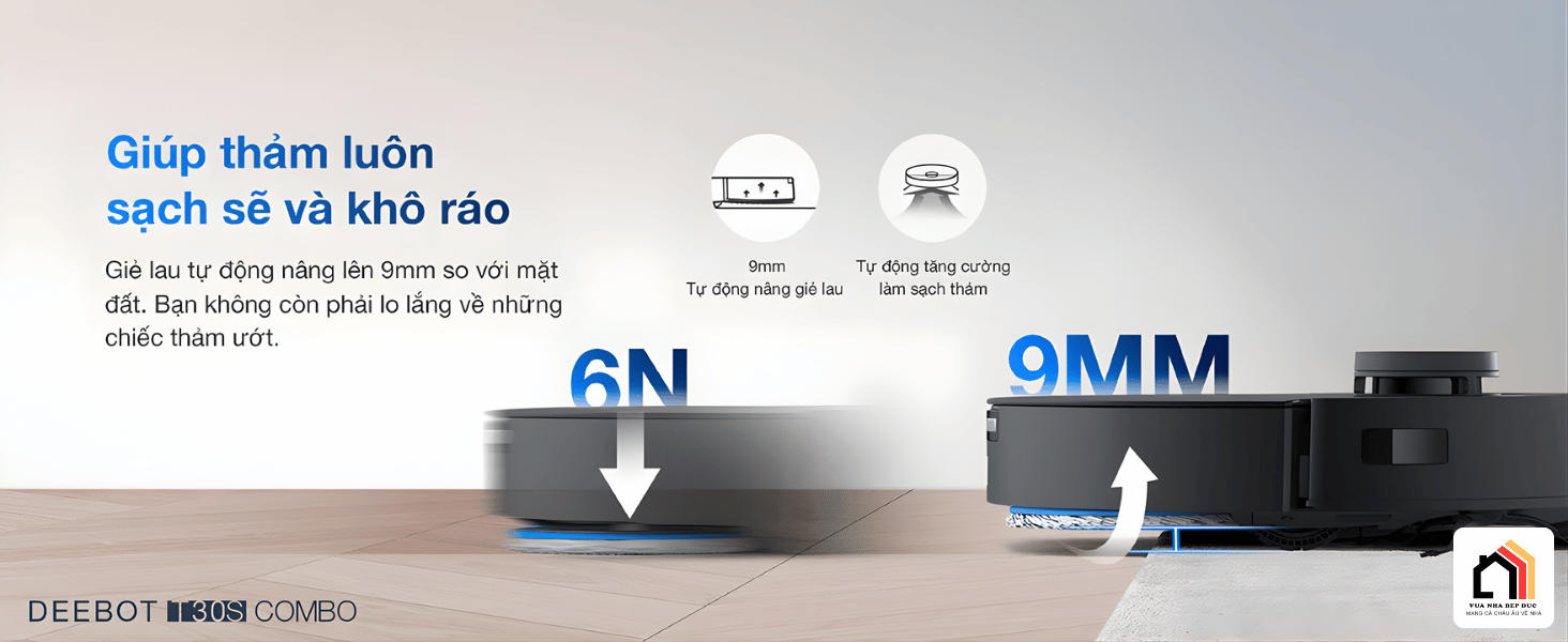 Đồng thời, Robot hút bụi lau nhà Ecovacs T30S Combo sẽ chuyển sang chế độ hút với lực hút tối đa để xử lý bụi bẩn trên thảm hiệu quả hơn. Tính năng này giúp đảm bảo vệ sinh toàn diện cho cả sàn cứng và thảm, đồng thời hạn chế tình trạng lây nhiễm chéo giữa các khu vực.