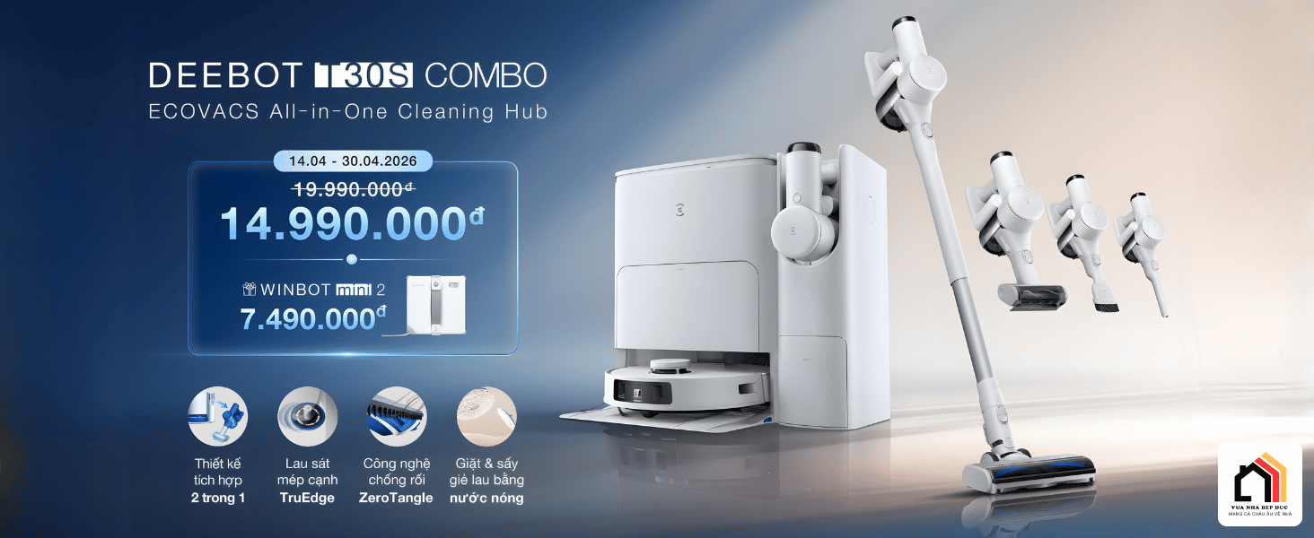Robot hút bụi lau nhà Ecovacs T30S Combo là giải pháp làm sạch toàn diện với thiết kế combo thông minh, kết hợp robot và máy hút bụi cầm tay đa năng. Sản phẩm nổi bật với công nghệ TruEdge™ lau sát cạnh, ZeroTangle™ chống rối tóc hiệu quả, lực hút mạnh mẽ 11.000Pa cùng hệ thống lau xoay OZMO Turbo 2.0. Bên cạnh đó, trạm OMNI tự động giặt giẻ nước nóng, sấy khô và hút bụi kép tiện lợi. Thiết bị còn tích hợp TrueDetect 3D 3.0, TrueMapping 2.0, điều khiển qua app, giọng nói AI và cảm ứng chân linh hoạt.