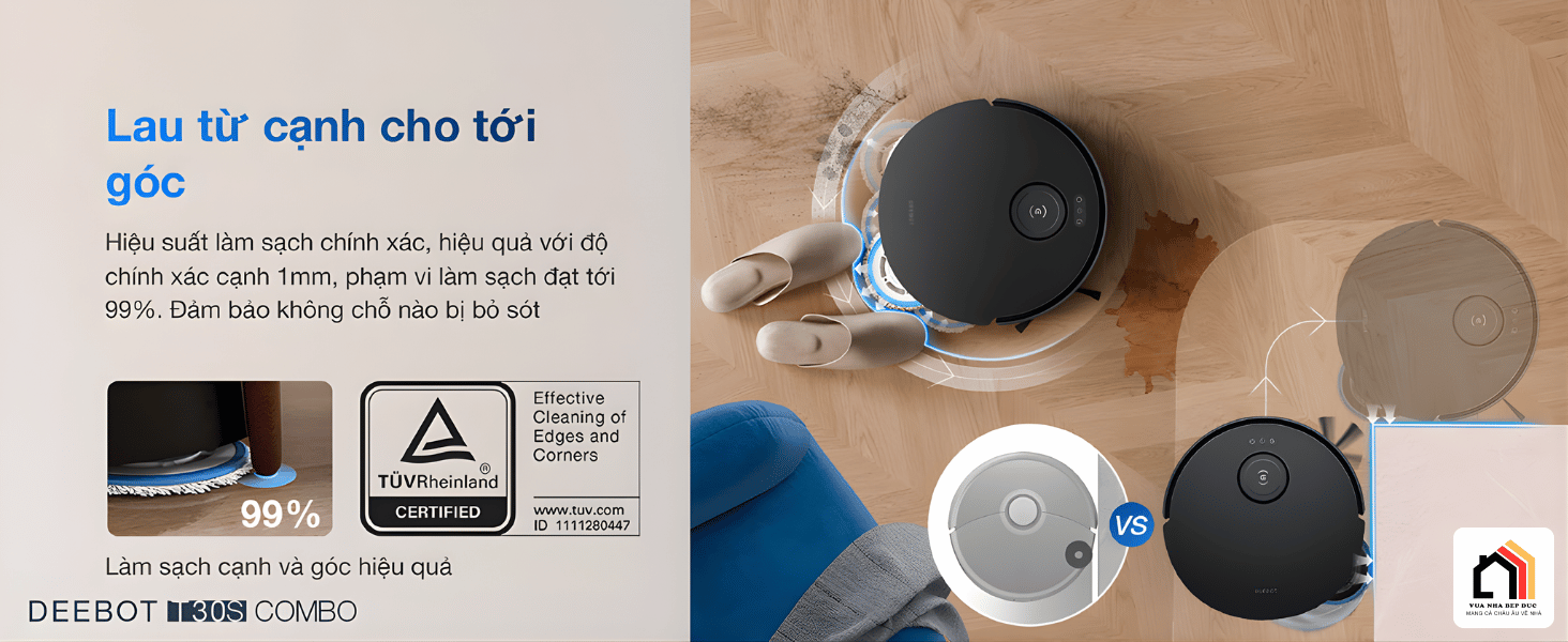 Robot hút bụi lau nhà Ecovacs T30S Combo được trang bị công nghệ TruEdge™ tiên tiến, giúp nâng cao hiệu quả làm sạch tại các khu vực sát tường và góc cạnh. Hệ thống giẻ lau có khả năng mở rộng linh hoạt, kết hợp cùng bộ điều khiển chính xác giúp robot dễ dàng tiếp cận những vị trí khó mà các dòng robot trước đây thường bỏ sót.