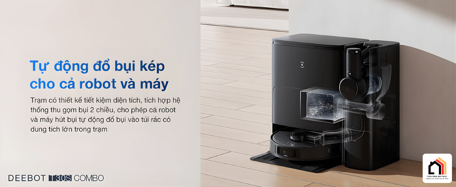 Robot hút bụi lau nhà Ecovacs T30S Combo được trang bị trạm OMNI đa năng, hỗ trợ tự động thu gom bụi cho cả robot và máy hút bụi cầm tay. Người dùng chỉ cần đặt thiết bị vào trạm, toàn bộ bụi sẽ được xử lý nhanh chóng trong khoảng 10 giây, hạn chế tối đa tình trạng bụi bay ngược ra ngoài.
