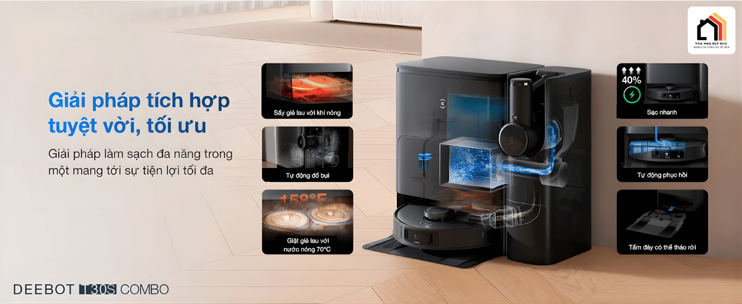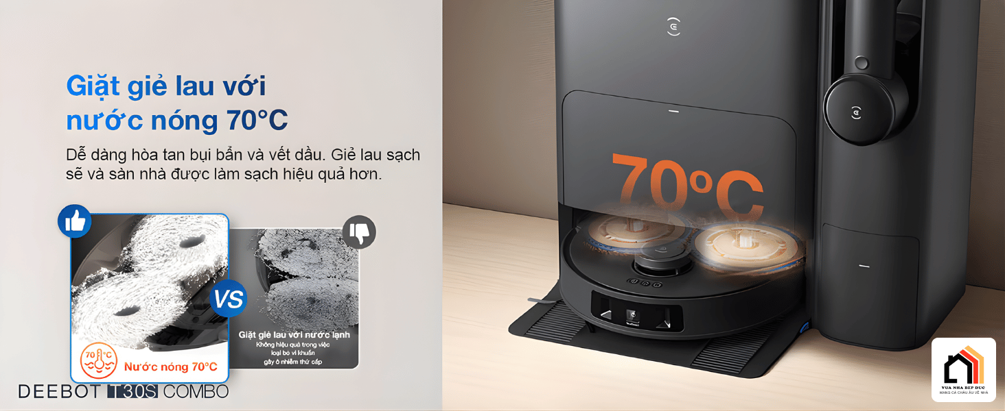 Trạm OMNI của Robot hút bụi lau nhà Ecovacs T30S Combo không chỉ dừng lại ở việc hút bụi mà còn tích hợp khả năng giặt giẻ lau bằng nước nóng 70°C. Công nghệ này giúp loại bỏ vi khuẩn và vết bẩn hiệu quả, đồng thời hạn chế tình trạng ô nhiễm chéo trong quá trình lau dọn.