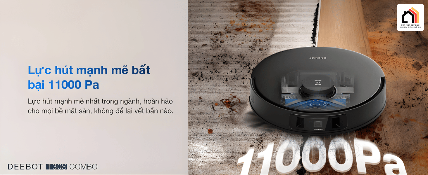 Robot hút bụi lau nhà Ecovacs T30S Combo được trang bị động cơ tốc độ cao, mang lại lực hút mạnh mẽ lên đến 11.000Pa. Nhờ thiết kế ống dẫn thẳng, thiết bị có thể dễ dàng hút sạch bụi bẩn, rác lớn trên cả sàn cứng và thảm, đảm bảo hiệu quả làm sạch vượt trội.