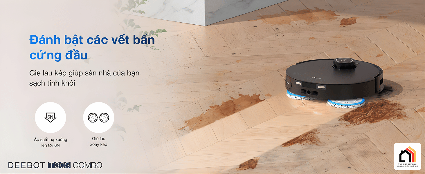 Bên cạnh đó, Robot hút bụi lau nhà Ecovacs T30S Combo còn tích hợp công nghệ lau xoay OZMO Turbo 2.0 với hai tấm giẻ xoay độc lập. Công nghệ này tạo áp lực chà mạnh mẽ, giúp đánh bay các vết bẩn cứng đầu, mang lại bề mặt sàn sạch bóng và không còn vết bám.