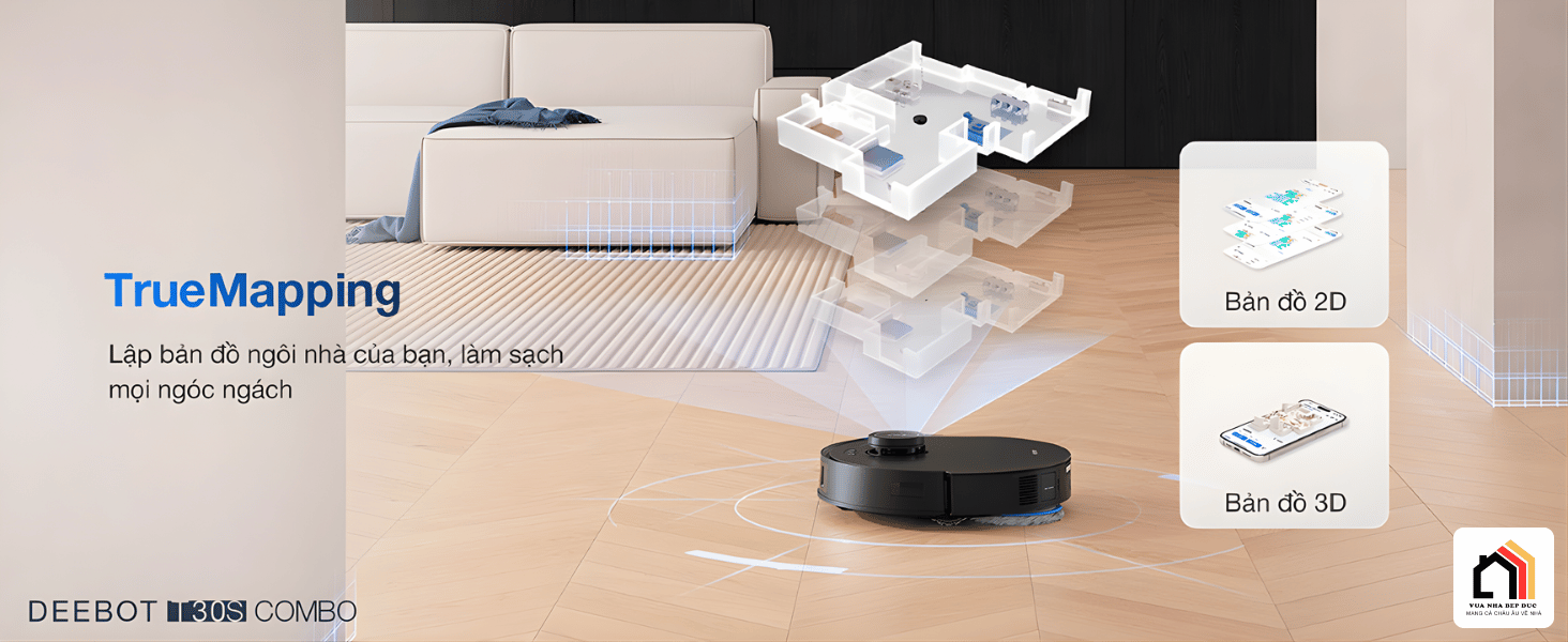 Robot hút bụi lau nhà Ecovacs T30S Combo sử dụng công nghệ TrueMapping 2.0 để xây dựng bản đồ không gian một cách nhanh chóng và chính xác. Thiết bị có thể quét và lập bản đồ diện tích lên đến 100m² chỉ trong khoảng 6 phút, giúp tối ưu hóa lộ trình di chuyển khi làm sạch.