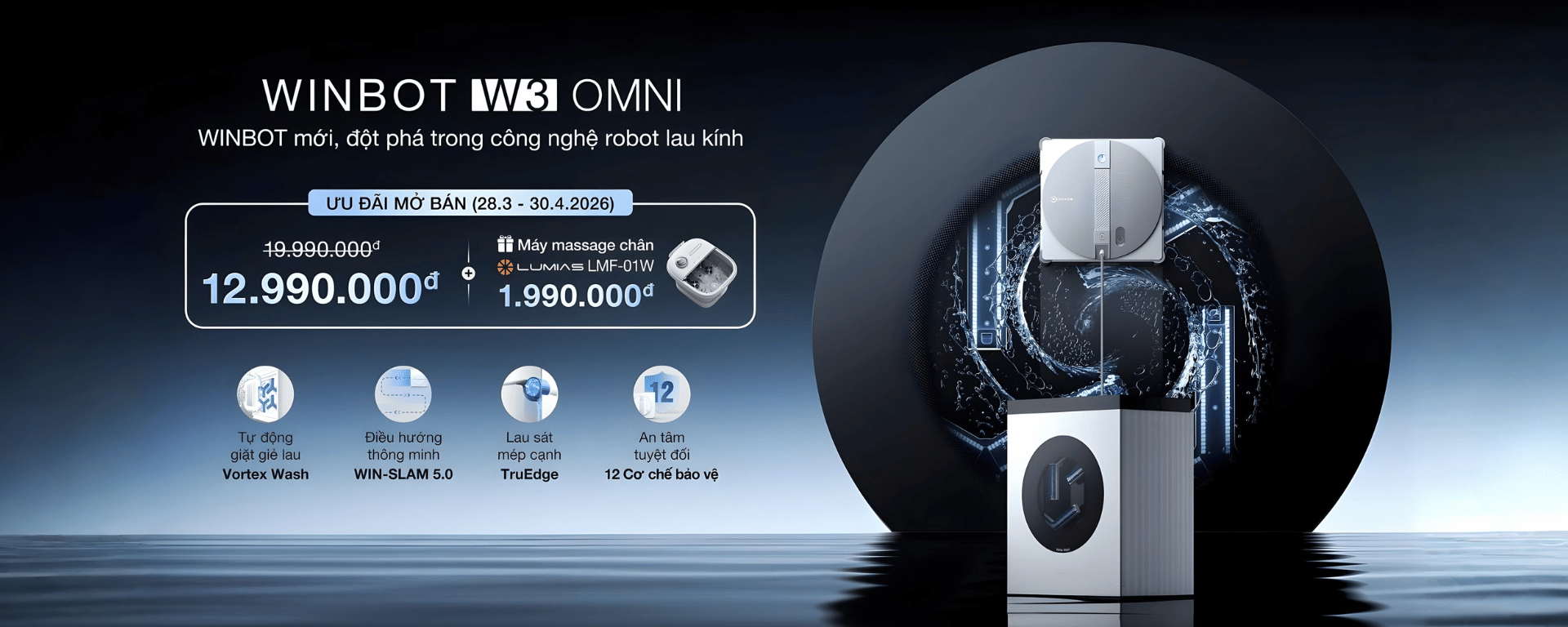 Robot lau kính Ecovacs Winbot W3 Omni là giải pháp làm sạch kính thông minh thế hệ mới, tích hợp hàng loạt công nghệ tiên tiến mang lại hiệu quả vượt trội. Sản phẩm nổi bật với công nghệ Vortex Wash tự động giặt giẻ chỉ trong 1 phút, trạm tự làm sạch khép kín tiện lợi, cùng 2 chế độ nguồn linh hoạt. Bên cạnh đó là hệ thống chống rơi an toàn, dây cáp 2 trong 1 gọn gàng, bộ 3 công nghệ làm sạch TruEdge, WIN-SLAM 5.0 và phun nước 3 vòi giúp xử lý mọi vết bẩn. Điều khiển 360° qua app và 12 lớp bảo vệ toàn diện giúp người dùng an tâm tuyệt đối.