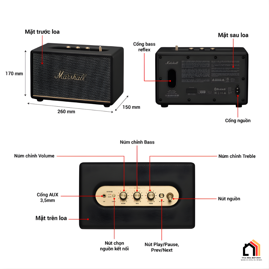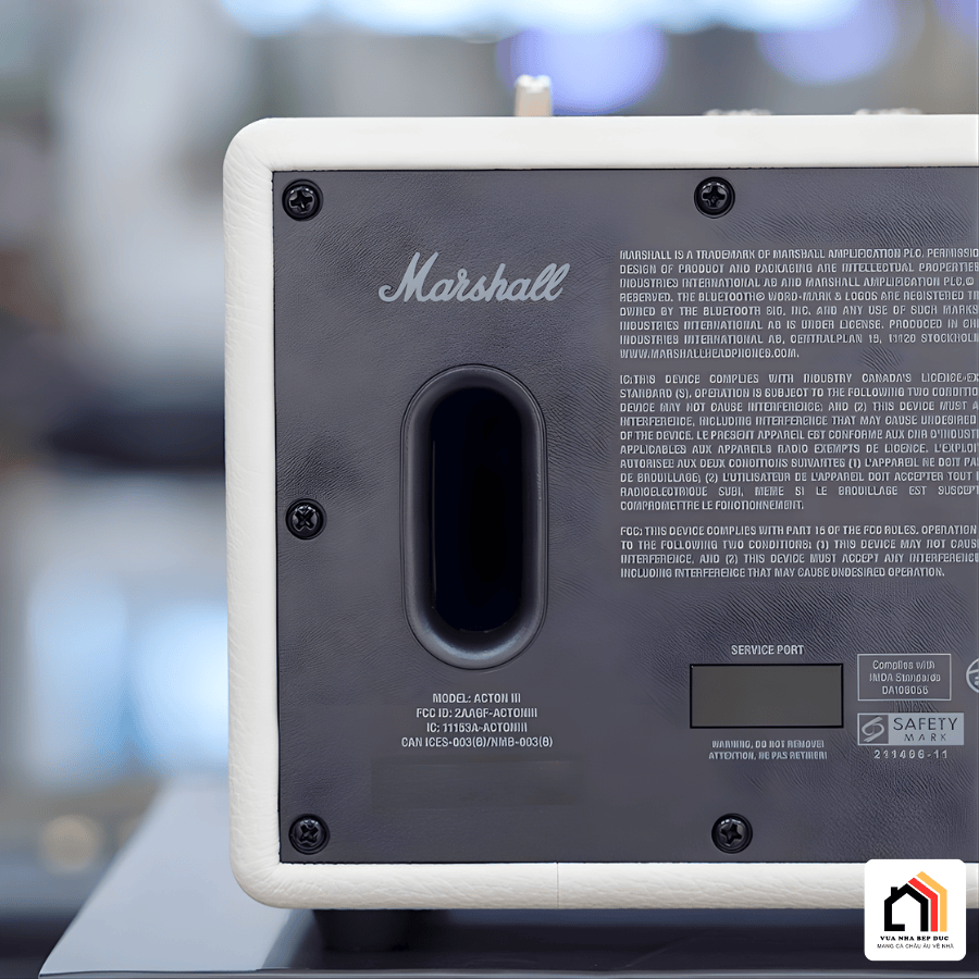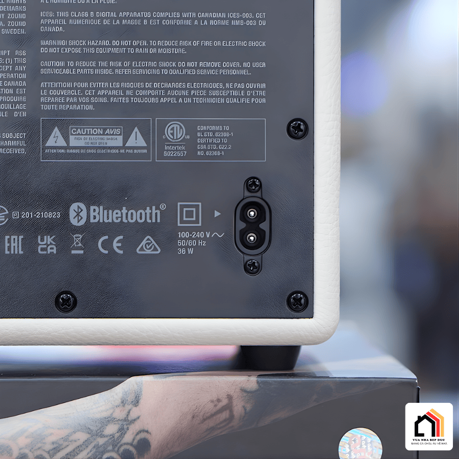 Loa Marshall Acton 3 sử dụng nguồn điện trực tiếp 100–240V (50/60Hz) với công suất tiêu thụ 36W, tương thích hoàn toàn với điện lưới 220V tại Việt Nam mà không cần thêm bộ chuyển đổi.