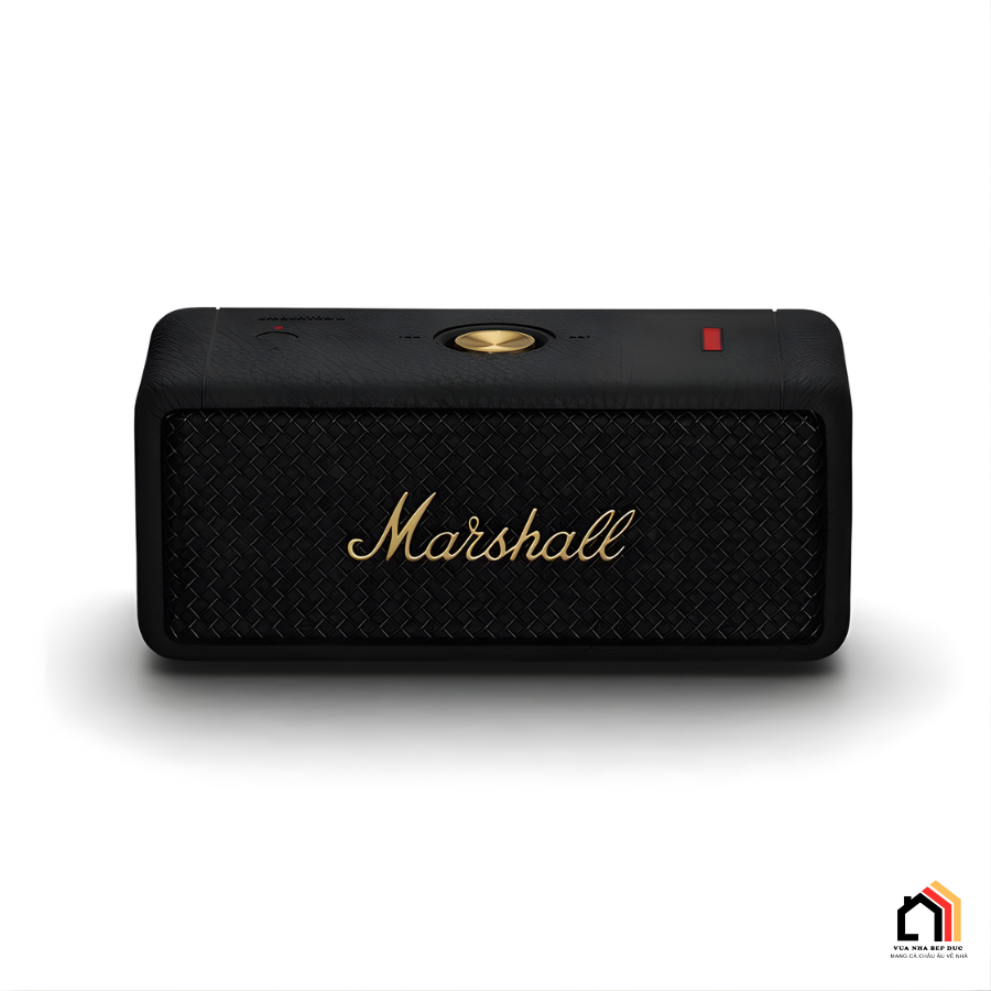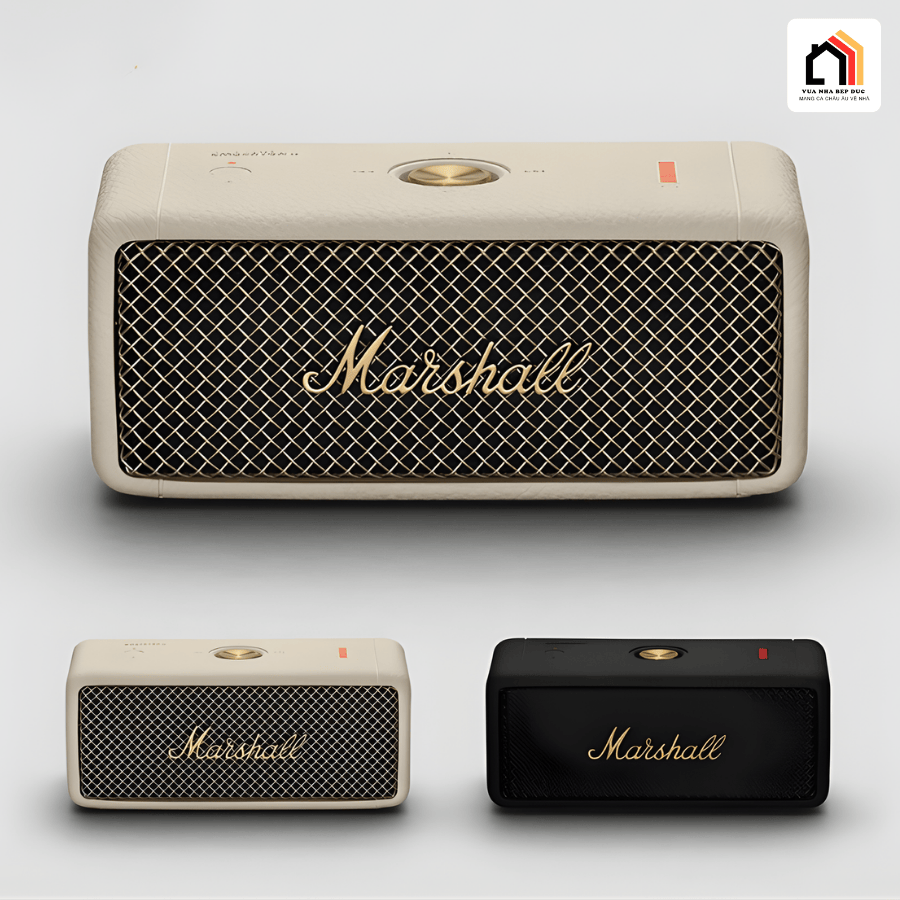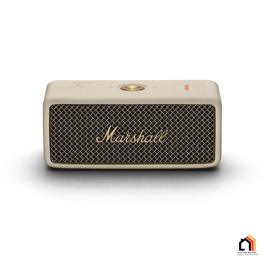 Mặt trước của loa Marshall Emberton 2 được hoàn thiện với ê-căng dạng lưới đan tinh xảo, logo “Marshall” màu vàng nổi bật đặt chính giữa, tạo cảm giác thoáng và sang trọng. Phía trên là cụm nút điều khiển đa hướng kết hợp hệ thống đèn LED báo pin, giúp việc sử dụng trở nên trực quan và dễ dàng hơn. Sản phẩm được ra mắt với hai phiên bản màu sắc gồm Black and Brass (đen phối vàng đồng) và Cream, mang đến lựa chọn trẻ trung, hiện đại cho người dùng.
