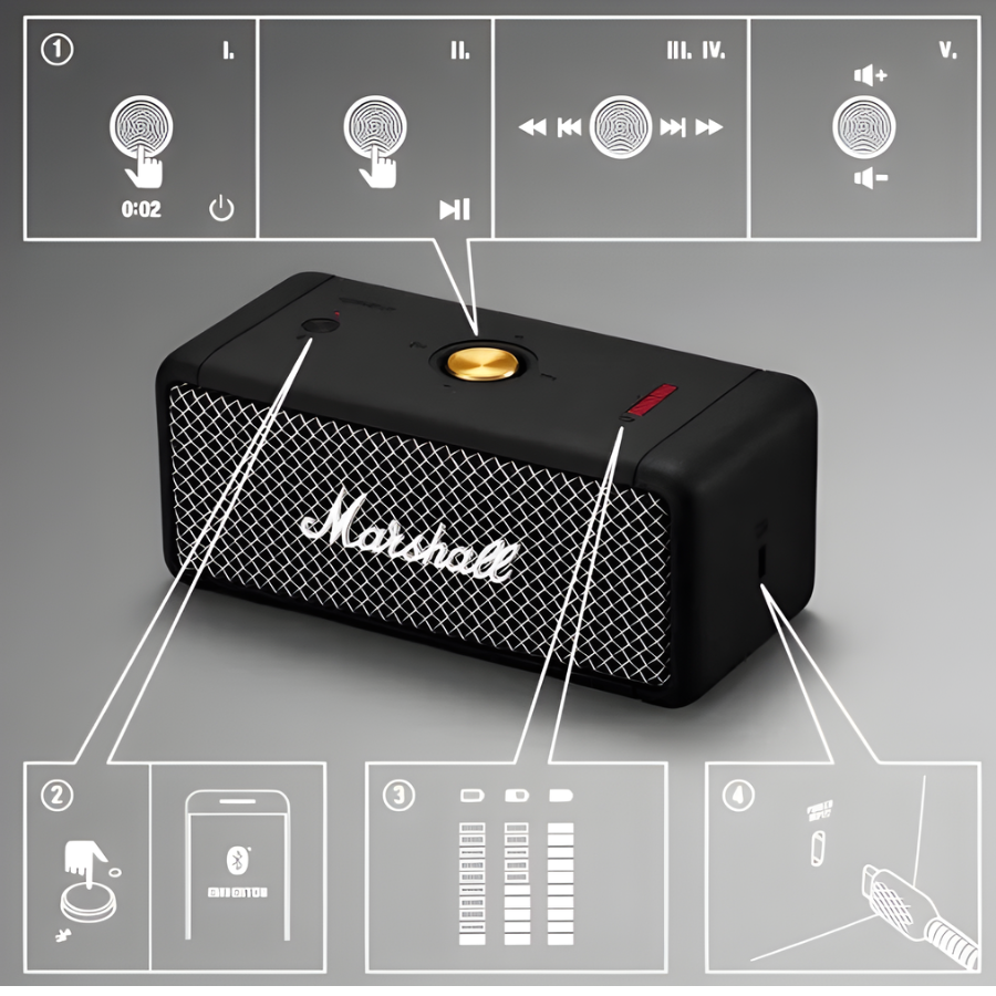 Trên đỉnh loa Marshall Emberton 2 là nút điều khiển đa hướng (Knob) màu vàng đặc trưng, cho phép thực hiện đầy đủ các thao tác như bật/tắt, phát/dừng nhạc, chuyển bài và điều chỉnh âm lượng. Kết hợp cùng nút Bluetooth và khả năng điều khiển qua ứng dụng Marshall Bluetooth, Emberton 2 trở thành một trong những mẫu loa di động có khả năng điều khiển tiện lợi và hoàn thiện nhất hiện nay. Hệ thống đèn LED báo pin trên mặt trên giúp người dùng dễ dàng theo dõi dung lượng pin trong quá trình sử dụng.