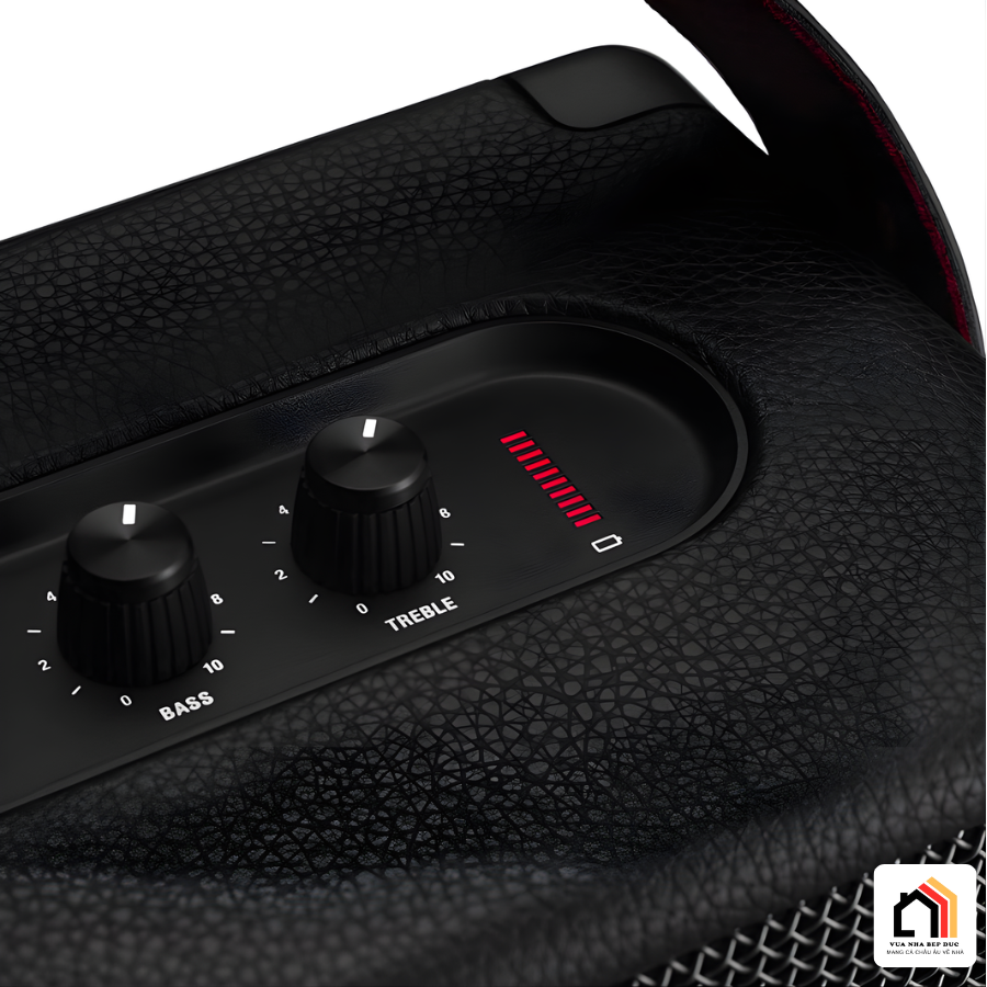 Bảng điều khiển phía trên của Loa Marshall Kilburn II được thiết kế với các núm xoay vật lý cho phép điều chỉnh âm lượng, âm trầm và âm bổng một cách trực quan. Người dùng có thể tinh chỉnh chất âm ngay trên Loa Marshall Kilburn II theo sở thích cá nhân mà không cần thông qua thiết bị trung gian. Hệ thống đèn LED hiển thị pin được bố trí gần núm điều khiển giúp bạn dễ dàng kiểm soát dung lượng pin còn lại.