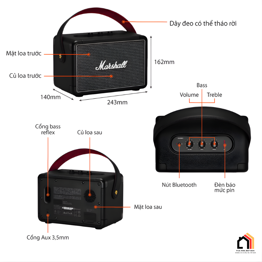 | Điều khiển | Bass control knob/Battery indicator/Bluetooth button/Power/volume knob/Treble control knob |