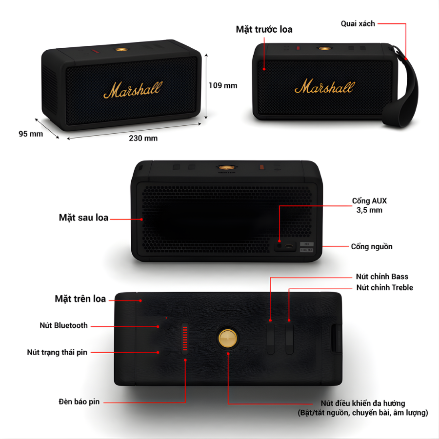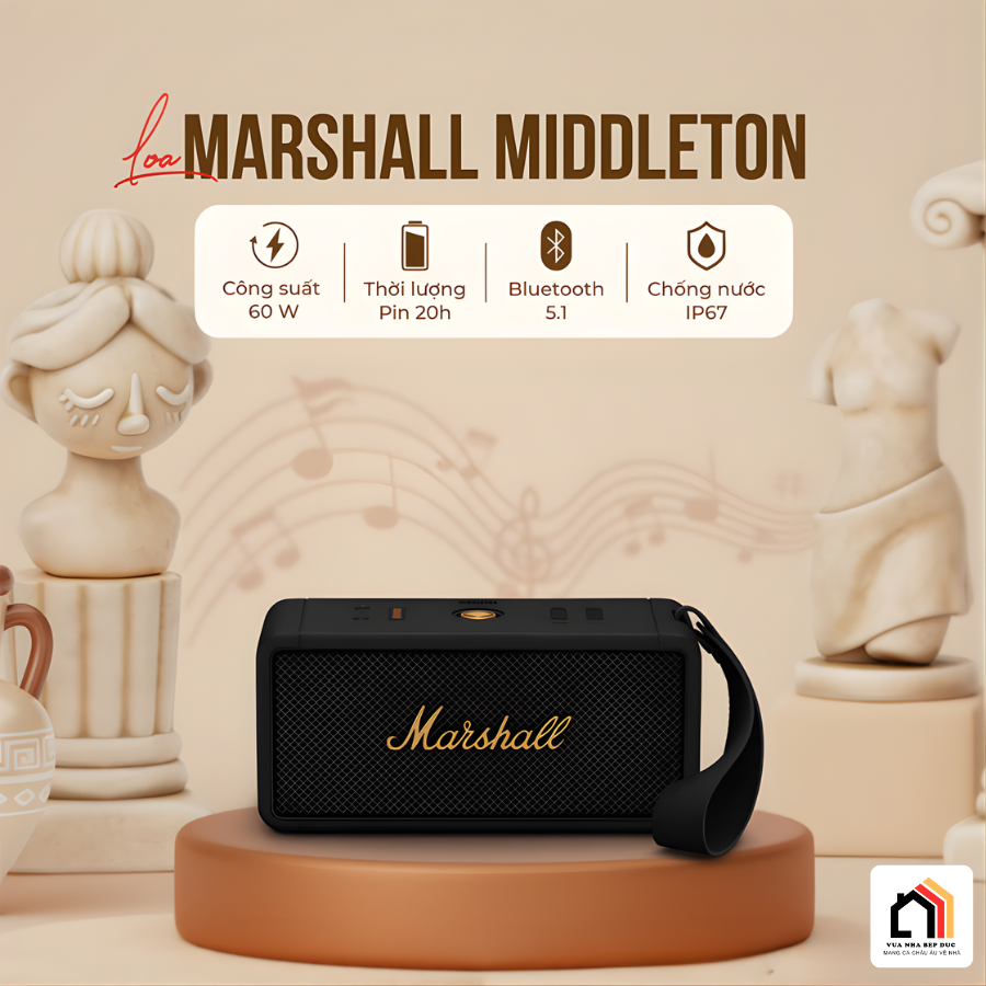 Loa Marshall Middleton được đánh giá là mẫu loa di động hoàn thiện bậc nhất của Marshall khi hội tụ đầy đủ những tinh hoa của dòng Portable. Sản phẩm gây ấn tượng với thiết kế nhỏ gọn dễ mang theo, chất âm mạnh mẽ ứng dụng công nghệ tiên tiến, thời lượng pin dài tới 20 giờ và khả năng chống nước, chống bụi chuẩn IP67. Bên cạnh đó, loa Marshall Middleton còn được trang bị hàng loạt tính năng cao cấp như Stack Mode, Bluetooth 5.1, sạc nhanh và sạc ngược, mang đến trải nghiệm sử dụng toàn diện cho cả nhu cầu nghe nhạc trong nhà lẫn ngoài trời.