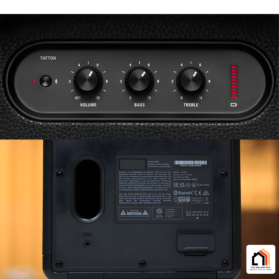 Phía trên Loa Marshall Tufton là bảng điều khiển dạng núm xoay quen thuộc của Marshall, bao gồm nút chỉnh âm lượng kiêm nút nguồn, nút điều chỉnh bass và treble. Ngoài ra còn có nút Bluetooth, đèn báo trạng thái kết nối và dải đèn LED hiển thị dung lượng pin rõ ràng, dễ theo dõi.