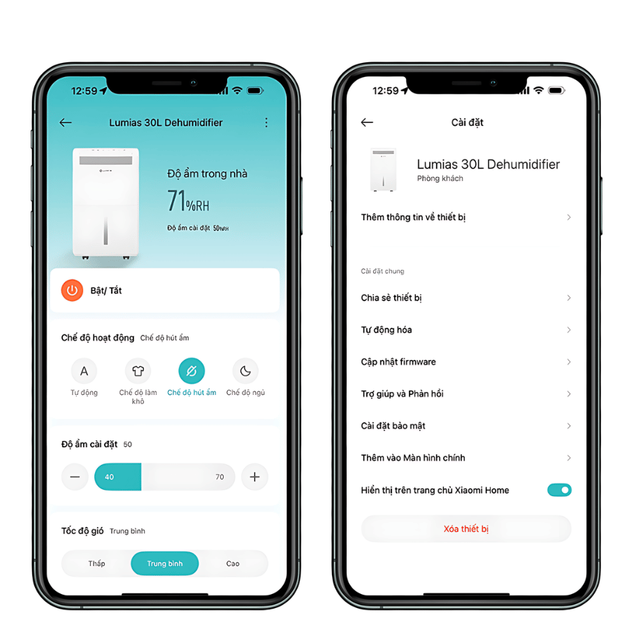 Điểm khác biệt đáng chú ý của máy hút ẩm Lumias D6S-30L nằm ở khả năng kết nối với ứng dụng MiHome trên điện thoại thông minh. Thông qua ứng dụng này, người dùng có thể dễ dàng bật hoặc tắt thiết bị, điều chỉnh mức độ ẩm mong muốn và theo dõi trạng thái hoạt động của máy dù đang ở bất kỳ đâu.
