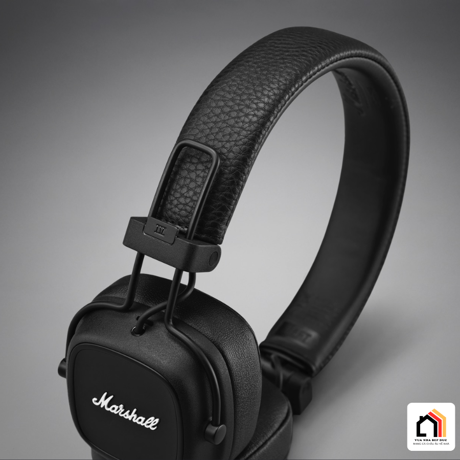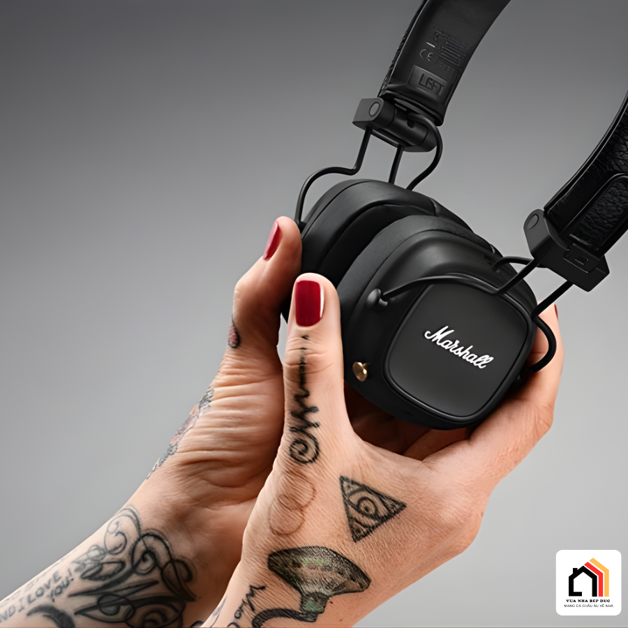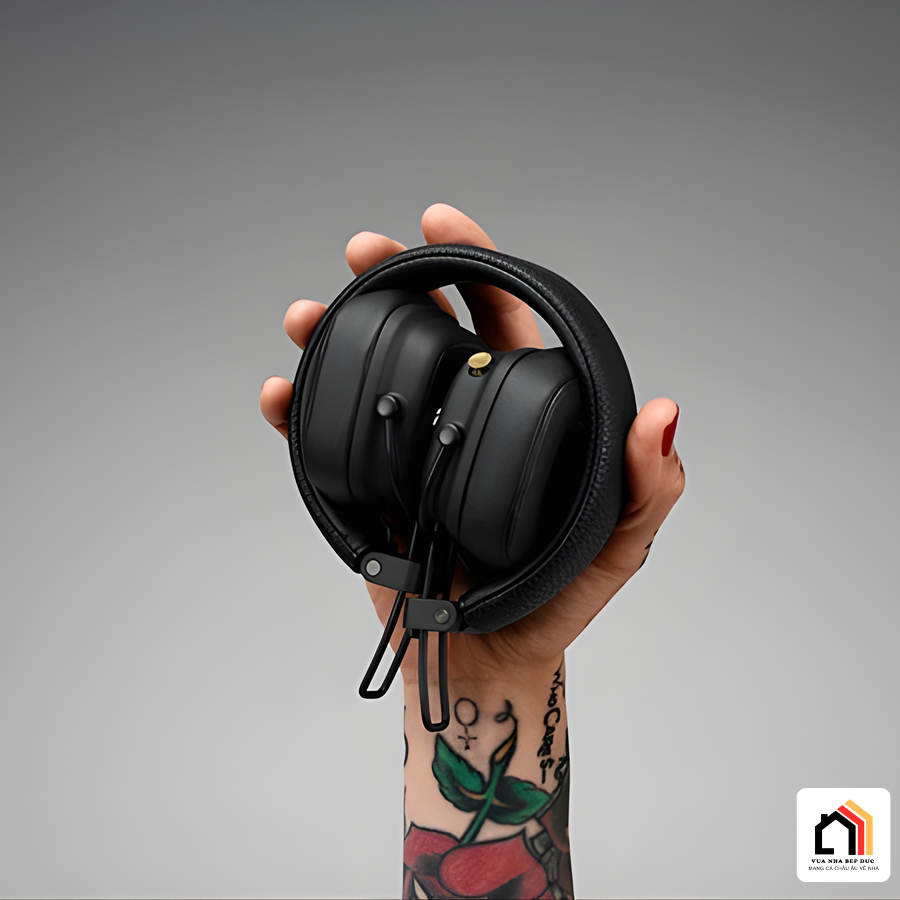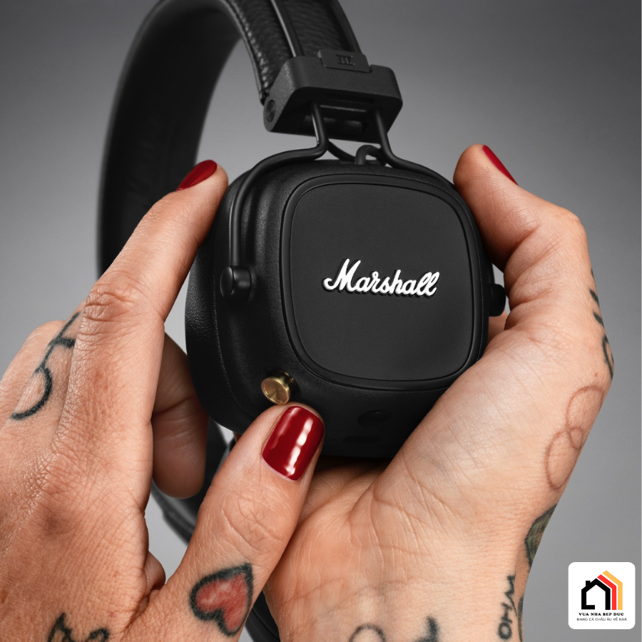 Tai nghe Marshall Major IV tiếp tục kế thừa phong cách thiết kế mang tính biểu tượng của dòng Major với kiểu dáng chụp tai vuông đặc trưng, gần như không thay đổi qua nhiều thế hệ. Điểm nhấn nổi bật nằm ở logo Marshall màu trắng tương phản rõ rệt trên nền đen mịn, tạo cảm giác sang trọng và dễ nhận diện. Ngoài ra, Marshall đã tinh chỉnh một số chi tiết nhỏ để Tai nghe Marshall Major IV trông hiện đại hơn, với bản lề kim loại chắc chắn, headband và earcup bọc giả da cao cấp, kết hợp đệm tai êm ái cho cảm giác đeo thoải mái trong thời gian dài. Đặc biệt, viền silicone được bổ sung giúp tai nghe cố định tốt hơn khi đặt trên đế sạc Qi.
