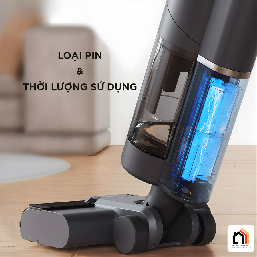 Đối với các mẫu máy hút bụi lau nhà chạy pin – đặc biệt là những dòng máy không dây đang rất phổ biến – thời lượng sử dụng là yếu tố cần được quan tâm. Một viên pin dung lượng lớn giúp bạn làm sạch được nhiều khu vực hơn trong một lần sạc. Hãy chú ý đến thời gian hoạt động liên tục của máy để đảm bảo đáp ứng đủ nhu cầu dọn dẹp của gia đình.