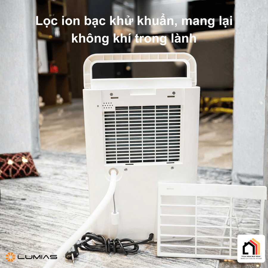 Máy hút ẩm Lumias D6S-12L không chỉ kiểm soát độ ẩm mà còn tích hợp bộ lọc ion bạc có khả năng khử khuẩn, loại bỏ vi khuẩn, nấm mốc trong không khí. Nhờ đó, không gian sống luôn sạch sẽ, trong lành và giảm thiểu mùi hôi ẩm mốc. Đây là tính năng đặc biệt hữu ích cho những gia đình có trẻ nhỏ, người lớn tuổi hoặc người nhạy cảm với môi trường ẩm thấp.