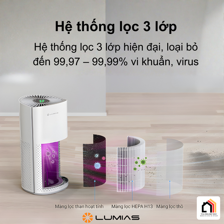Hệ thống lọc 3 lớp loại bỏ đến 99,99% bụi mịn, vi khuẩn và nấm mốc.