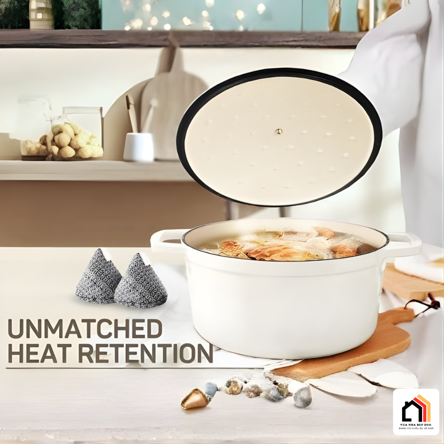 Một trong những giá trị cốt lõi làm nên chất lượng của nồi gang tráng men cao cấp Ciwete nằm ở phần thân và nắp được đúc từ gang nguyên khối. Chất liệu này giúp nồi hấp thụ nhiệt chậm nhưng tỏa nhiệt đều khắp bề mặt, đảm bảo thực phẩm chín đều từ trong ra ngoài. Nhờ khả năng giữ nhiệt vượt trội, các món hầm, súp, cháo hay kho luôn đạt độ mềm hoàn hảo, hương vị đậm đà và không bị khê cháy.