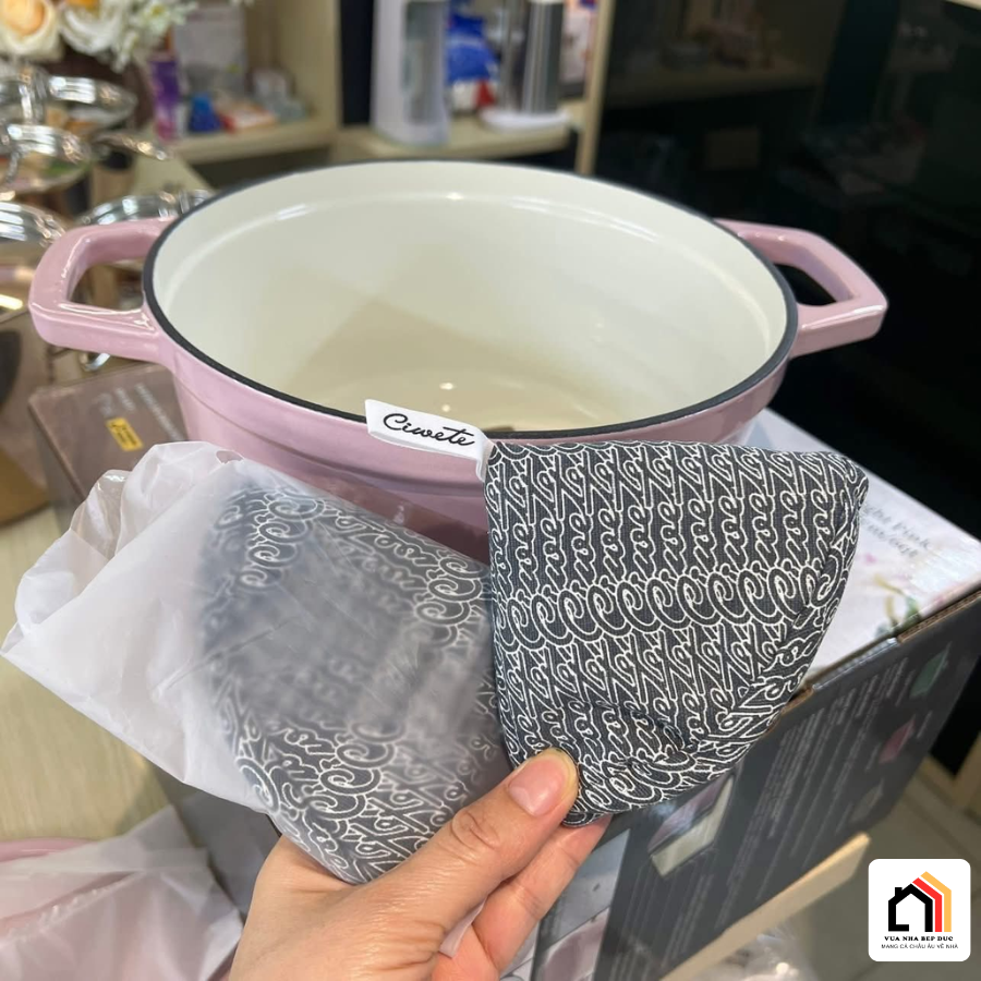Khi lựa chọn nồi gang tráng men cao cấp Ciwete phiên bản Pastel, người dùng còn nhận được ưu đãi thiết thực đi kèm. Sản phẩm được tặng kèm 2 miếng lót tay chống nóng nhỏ gọn, giúp thao tác nấu nướng an toàn và thuận tiện hơn. Đây là món phụ kiện hữu ích, đặc biệt khi cần di chuyển nồi nóng từ bếp ra bàn ăn hoặc lò nướng.