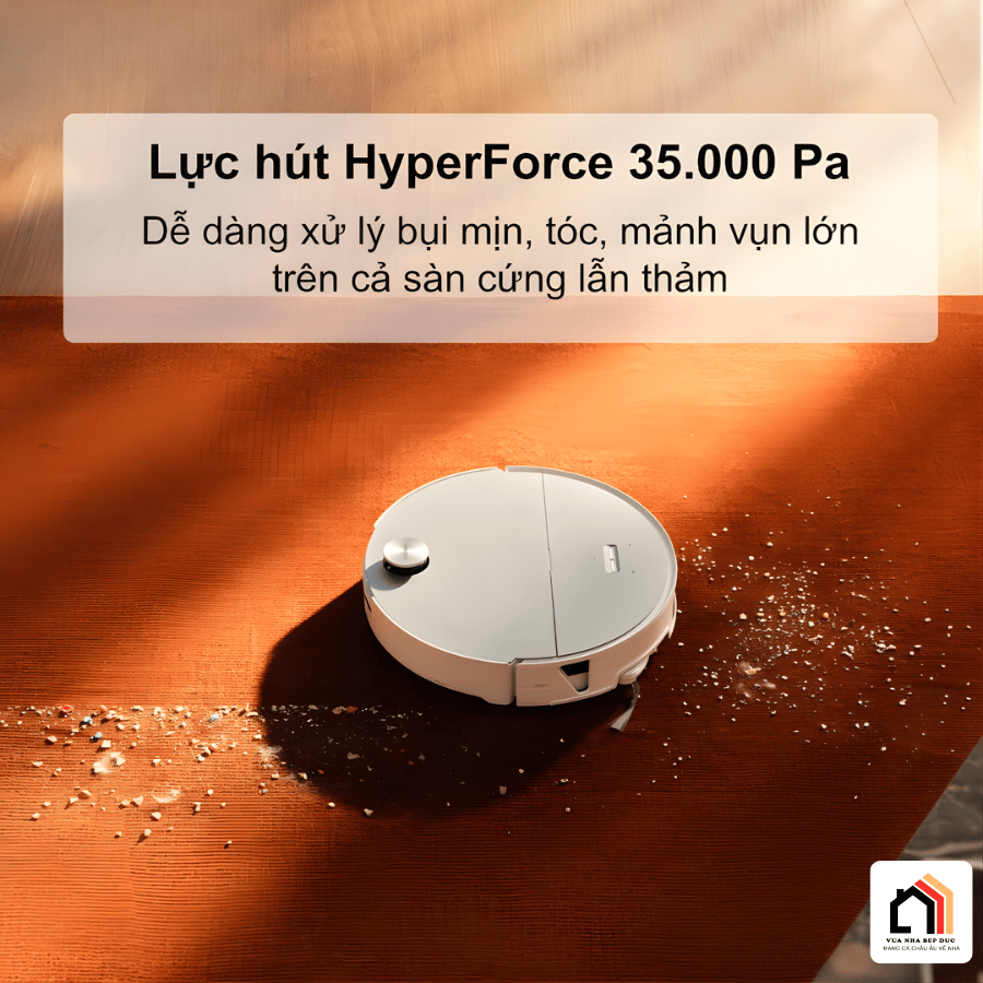 Một trong những điểm nổi bật nhất của Robot hút bụi lau nhà Roborock Saros 20 Sonic chính là lực hút HyperForce mạnh mẽ lên tới 35.000 Pa. Đây là mức lực hút vượt trội, cho phép robot dễ dàng thu gom bụi mịn, tóc, vụn thức ăn và cả cát vệ sinh thú cưng chỉ trong một lần di chuyển.