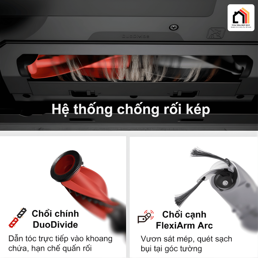 Chổi chính DuoDivide sử dụng hai trục chổi xoay ngược chiều, giúp tách tóc và lông thú ngay khi tiếp xúc, dẫn thẳng vào ống hút trung tâm với hiệu quả loại bỏ tóc gần như tuyệt đối. Bên cạnh đó, chổi cạnh FlexiArm Arc thiết kế dạng cong giúp gom bụi sát cạnh tường mà không giữ lại tóc, kể cả những sợi dài tới 40cm. Nhờ vậy, robot hoạt động ổn định, giảm tối đa công việc vệ sinh thủ công sau mỗi lần sử dụng.