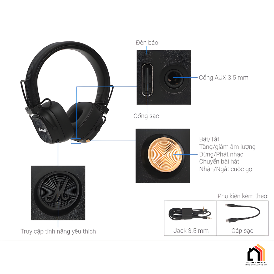 Tai Nghe Marshall Major V được tích hợp núm điều khiển đa hướng tiện lợi, cho phép thực hiện nhanh các thao tác như phát, tạm dừng, chuyển bài, điều chỉnh âm lượng và bật tắt nguồn. Cách bố trí này giúp người dùng dễ dàng kiểm soát quá trình nghe nhạc mà không cần thao tác trực tiếp trên thiết bị phát.
